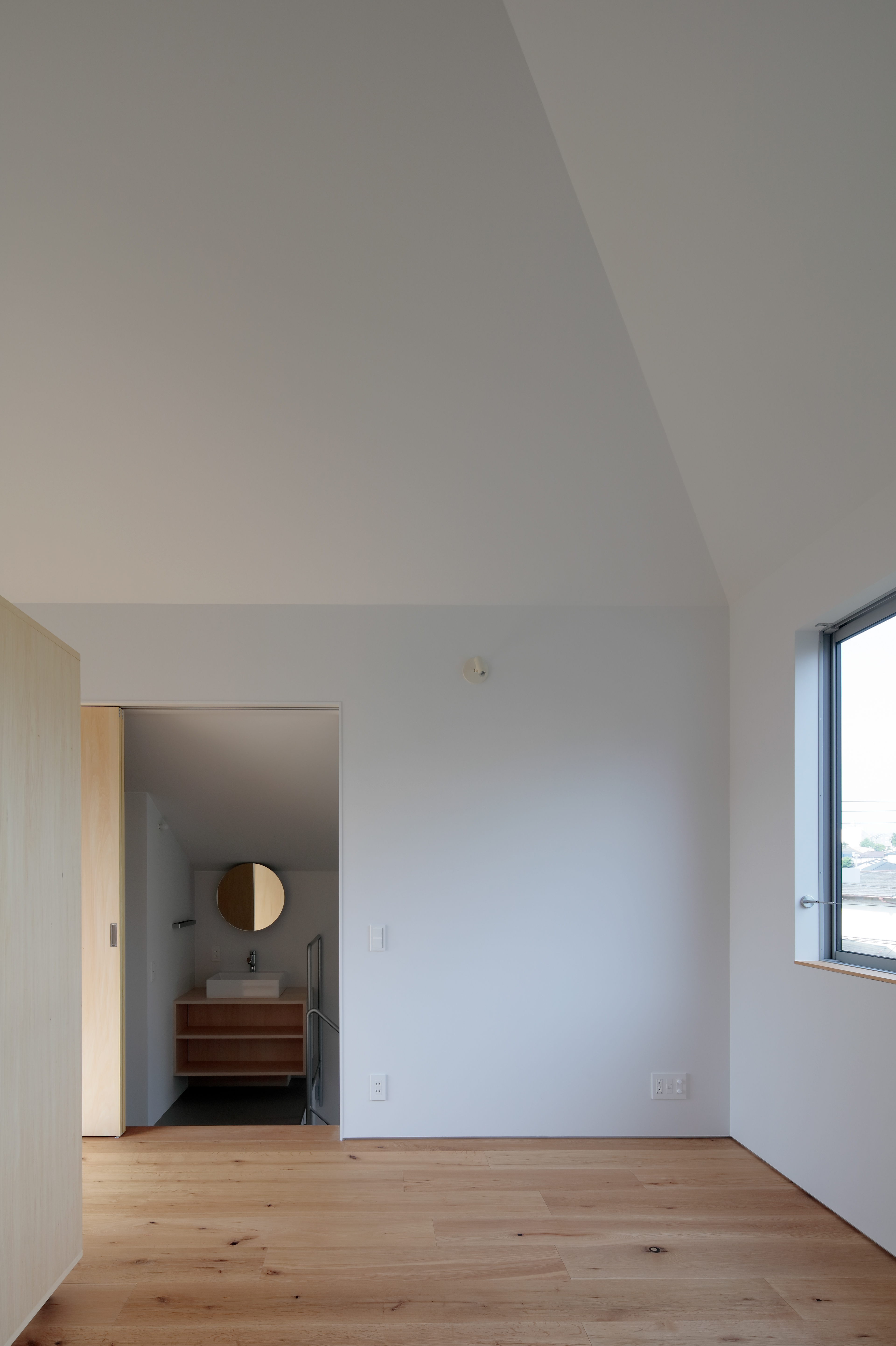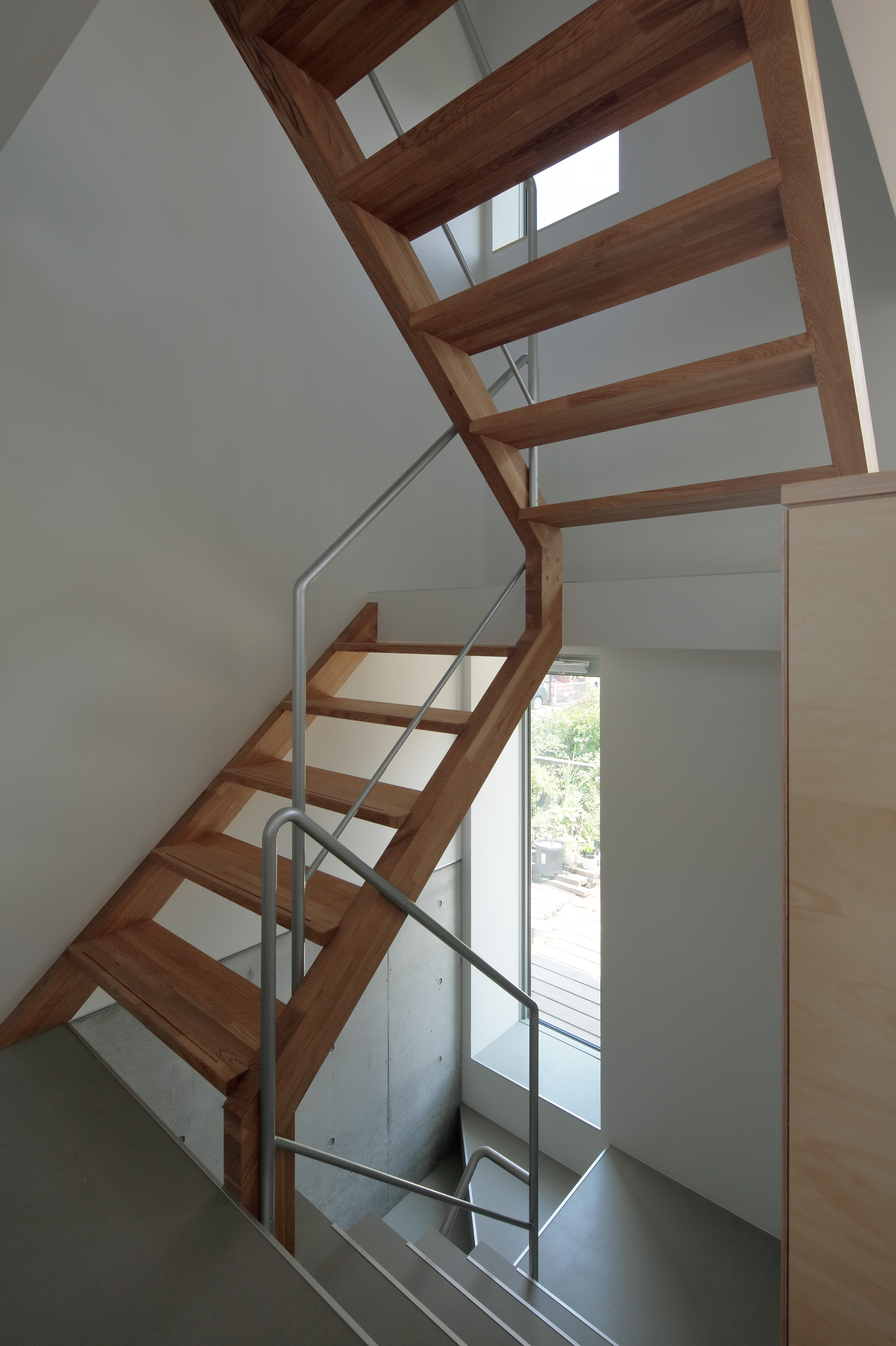 明快な構成の主屋と、これを成立させるために複数の機能を受け持つ下屋、レベル差のある地盤をつなぐ擁壁と半地下の鉄筋コンクリートで、この住宅は構成されています。もとは隣家の大きな庭の一部であった敷地に対して、前面道路側に建物配置を寄せフットプリントを小さくして3階建ての構成とすることで、庭をできるだけ大きく残して明るく開放的な生活ができる住まいを目指しました。